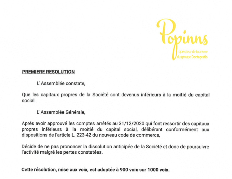 Le gouvernement a décidé d’alléger cette année dans la loi DDADUE 3 du 9 mars 2023 les modalités de régularisation des fonds propres négatifs mais qui ne modifie en rien le délai de deux ans pour soit reconstituer les fonds propres, soit ramener les fonds propres à au moins la moitié du capital social. Le tribunal de commerce ne peut dans les faits que prononcer la dissolution de DG Holidays, dont les créanciers pourront alors se retourner vers la maison mère, DH Hotels, qui elle aussi opère avec des fonds propres négatifs depuis 2021.