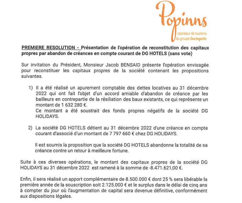 Notons également que Jacob Bensaïd est présenté comme président dans le procès verbal déposé au greffe du tribunal de commerce. Président de quoi ? DG Holidays et DG Hotels sont des SARL, elles ont des gérants, non pas des présidents. Selon les statuts et PV en notre possession, c’est Bernard Bensaïd qui gère ces deux sociétés, pas son fils. Ailleurs dans ce PV, Jacob Bensaïd est présenté comme directeur général des activités hôtelières du “groupe” Avec, ce qui est erroné. Jacob Bensaïd ne détient pas de mandat social dans Avec SA, ni dans DG Hotels, ni dans DG Holidays.