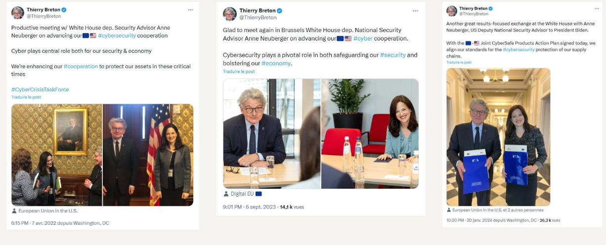 La question se pose de savoir pourquoi Thierry Breton, commissaire européen au marché intérieur, rencontrait de manière très régulière - environ tous les deux mois - Anne Neuberger, alors conseillère adjointe à la sécurité nationale de Joe Biden, qui fut aussi la directrice adjointe de la NSA sous l’administration Obama.