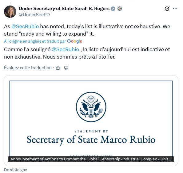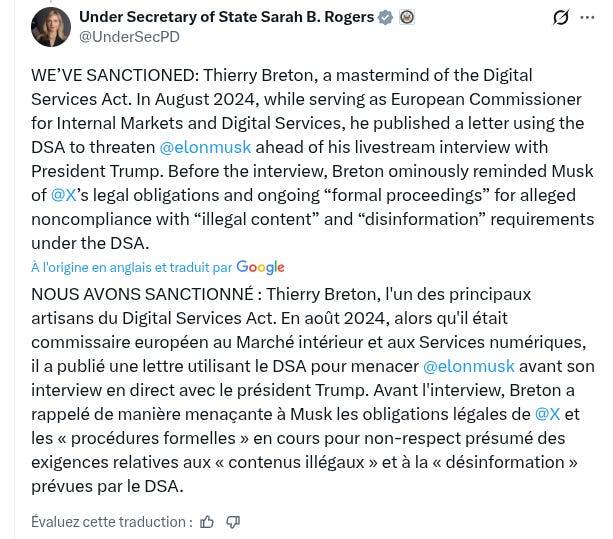 Le Département d'Etat vient de sanctionner cinq individus en Europe, dont Thierry Breton, qui trempent tous dans le complexe industriel de censure.