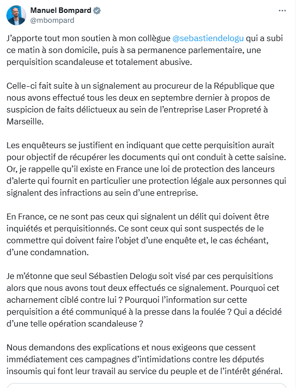 Manuel Bompard a publié un tweet victimaire, arguant que c’est le monde à l’envers : le lanceur d’alerte est inquiété.