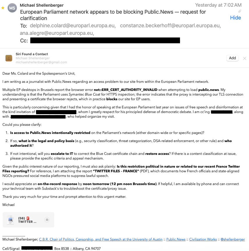 Le média américain qui a publié les Twitter Files France, dirigé par Michael Shellenberger, est inaccessible depuis les ordinateurs du Parlement européen.