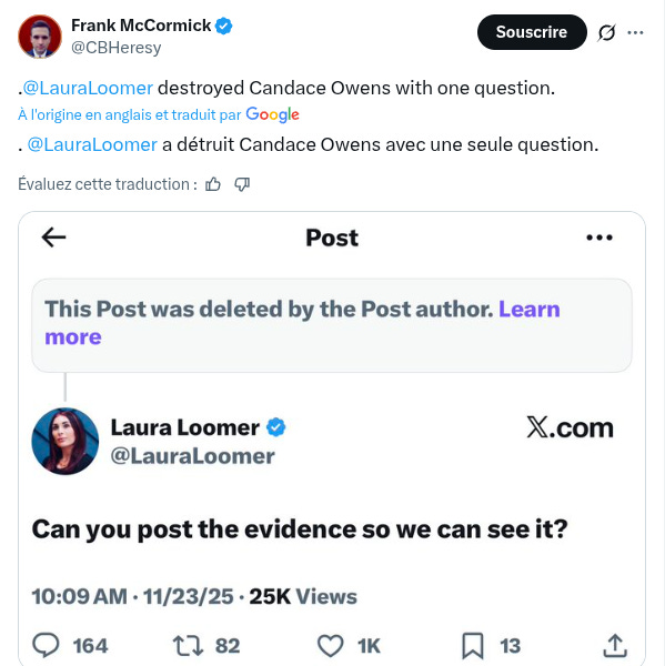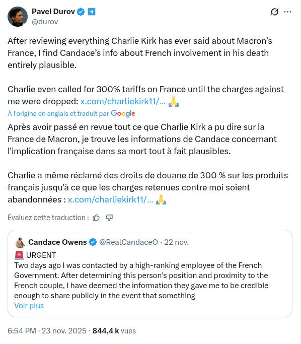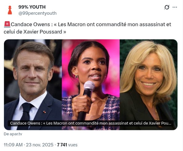 The virality of Candace Owens’s statements is such—again, no reason to doubt she was actually contacted by a source whose role was to feed her disinformation—that it will be enough for Emmanuel Macron and his crew to say, ‘Look at social media,’ and thus justify censorship… not to mention that it will also help discredit Candace Owens, which will greatly please those who unconditionally support the now criminal State of Israel.