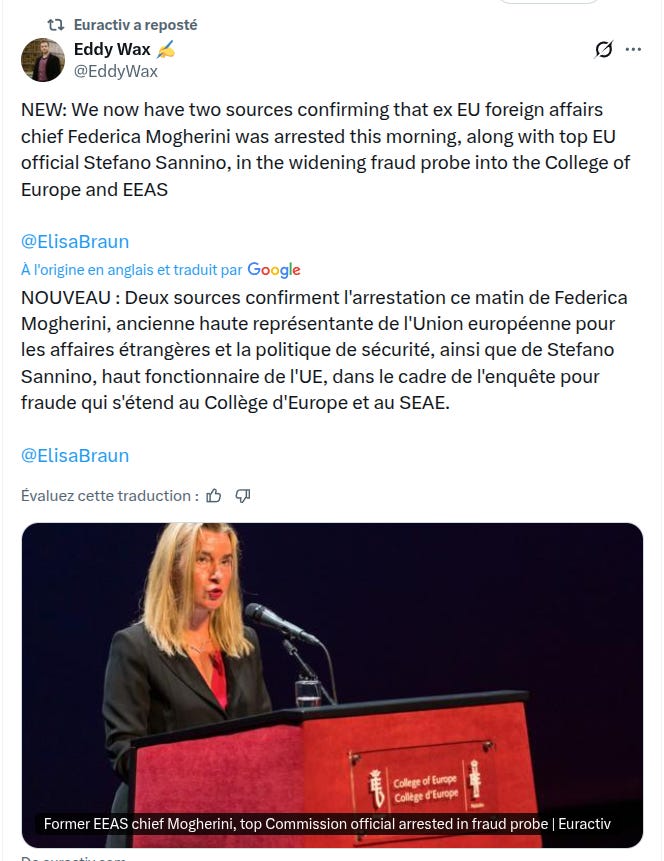 Federica Mogherini, the former High Representative of the European Union for Foreign Affairs—now conveniently serving as the rector of the College of Europe (an ‘elite factory’ in the mold of the French ENA, pumping out tomorrow’s EU mandarins)—has been taken into police custody. She is not alone. Three other individuals are also in the hot seat as part of a sprawling investigation into a smorgasbord of charges: “fraud in the awarding of public contracts, corruption, influence peddling, and violation of professional secrecy.”