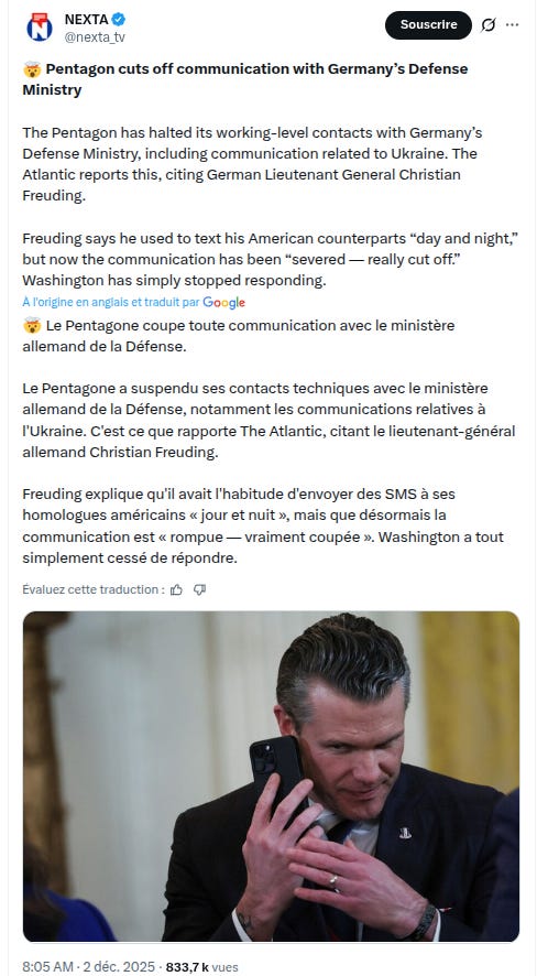 On December 1st, we learned in The Atlantic that the Pentagon—evidently fed up with the incessant calls and text messages—had simply cut off all communication with the German Ministry of Defence regarding Ukraine.