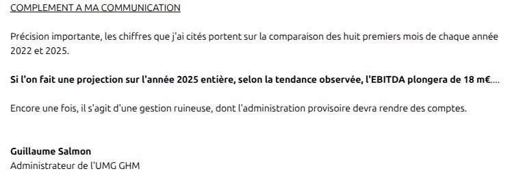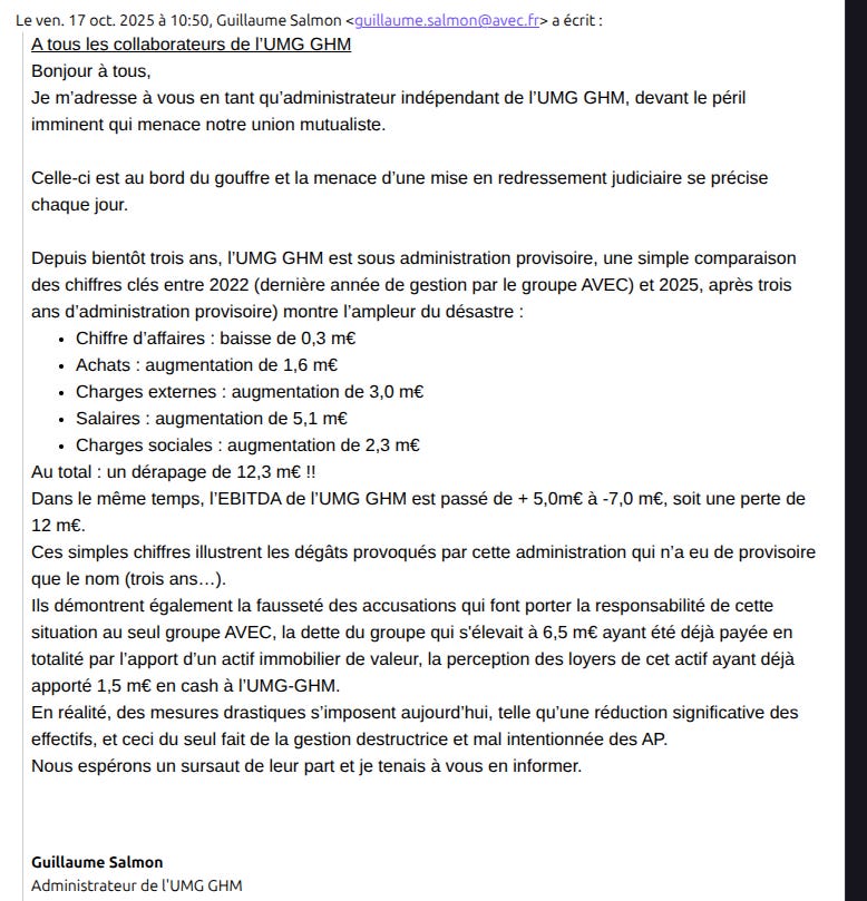 Dans un courriel adressé à tous les employés du Groupe hospitalier mutualiste (GHM), Guillaume Salmon fait porter la responsabilité des pertes du GHM aux administrateurs provisoires, nommés par la justice en 2023 pour gérer la clinique en lieu et place de Bernard Bensaïd et de ses séides, suite aux graves dysfonctionnements qu’ils ont causés.