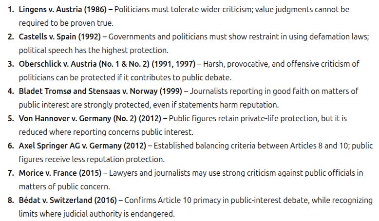 The following summary table highlights key rulings by the European Court of Human Rights (ECtHR). These cases illustrate a recurring tension: French law provides and French courts often impose sanctions for criticism of public figures, defamation, or controversial speech that the ECtHR deems disproportionate, particularly when involving political debate, journalism, or satire.