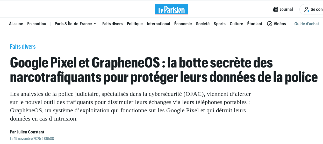 Alors que cet été, les données de 13 millions de Français provenant de l’Agence nationale des titres sécurisés (ANTS) auraient été piratées - l’ANTS le dément, le problème est qu’on en retrouve sur le darkweb - et que pas plus tard que le 1er décembre, Pôle emploi a annoncé une nouvelle fuite de données concernant 1,6 million de personnes y étant inscrites, au lieu de durcir la sécurité des systèmes d’information en laissant travailler ceux qui savent, à commencer l'Agence nationale de sécurité des système d’information (ANSSI, ces fonctionnaires sont excellents), et d’arrêter imposer l’utilisation de logiciel Microsoft et d’autres bouses américaines (percluses de portes dérobées donc peu sûres) et de multiplier les plateformes afin de faire de la com’ et surtout de générer des marchés publics pour les copains ou les cabinets de conseil dans lesquels on espère pantoufler, ne voila-t-il pas que des ronds-de-cuir chargent sabre au clair le système d’exploitation libre pour smartphone Graphene OS.