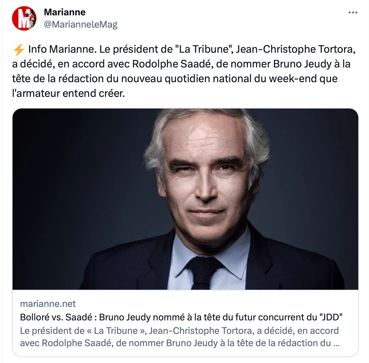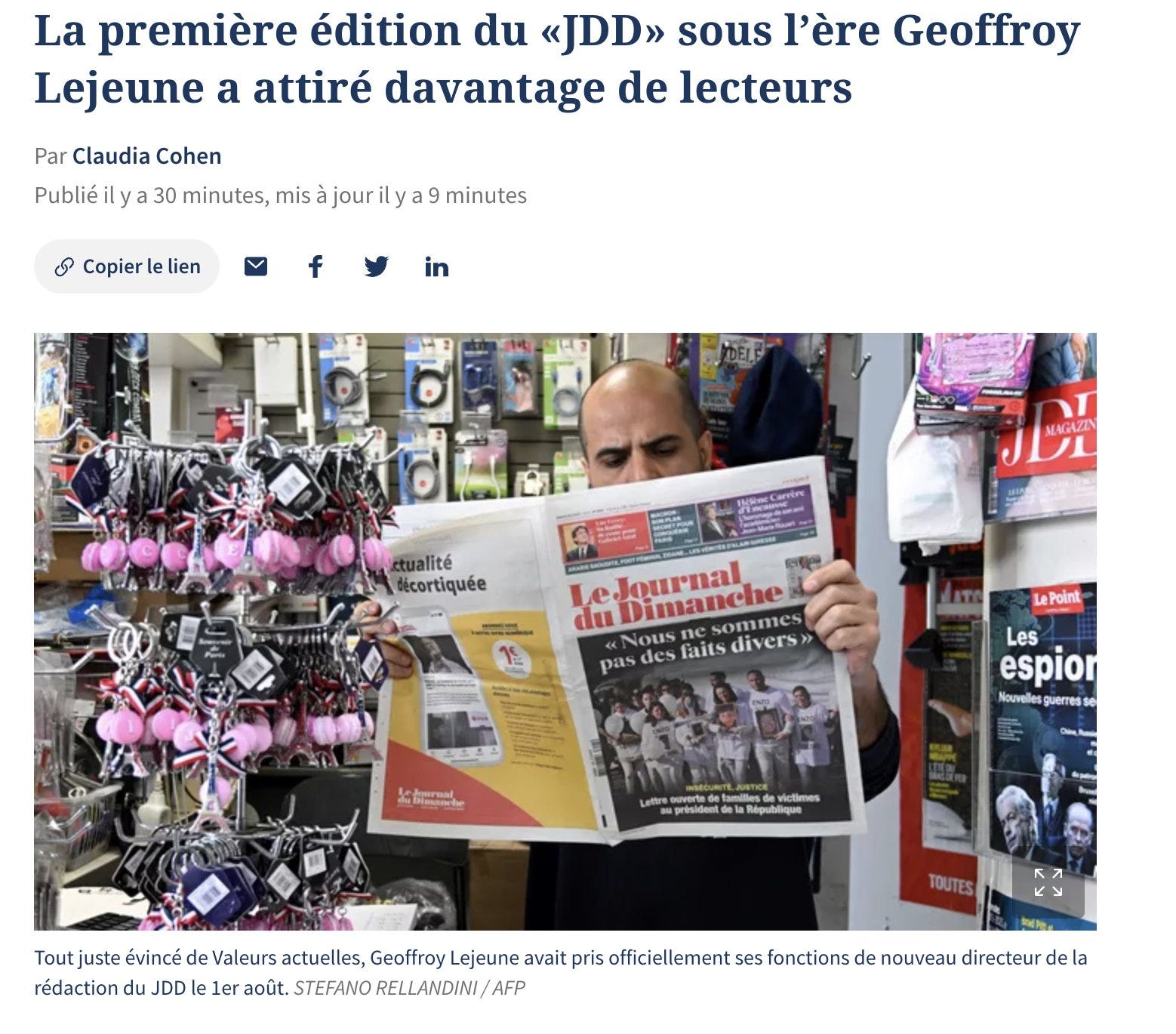 En attendant, le JDD nouvelle formule a explosé le compteur avec +22% de ventes en kiosque pour son premier numéro. Vu le coût de lancement faramineux d’un hebdomadaire national, gageons que l’expérience de MM. Saadé et Jeudy aura une durée de vie bien plus courte que celle du “Matin de Paris”, le quotidien du Nouvels Obs, qui avait duré 10 ans, toutes à pertes, de 1977 à 1987, à une époque où il n’y avait pas internet. A moins bien sûr que la seule fonction de cette version hebdomadaire de La Tribune ne vise, comme la création du Matin de Paris, qu’à influencer les prochaines élections présidentielles…
