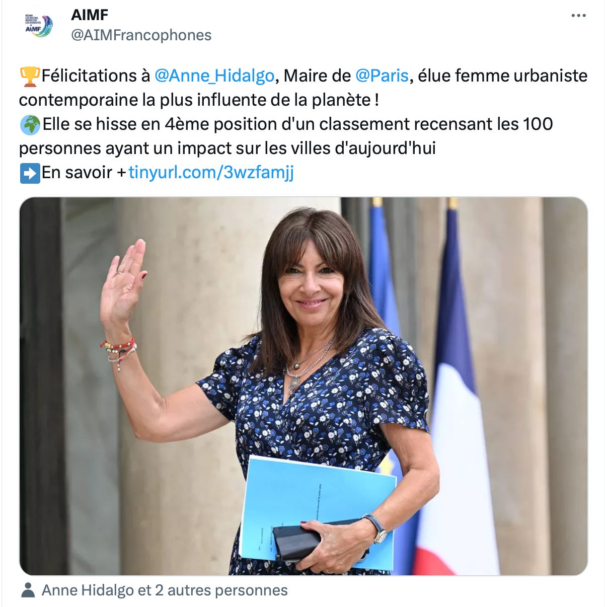 Bien. On va re-contextualiser tout ça. Le 21 mars, la maire de Paris accordait une subvention de 1.633.000€ à l'Association Internationale des Maires Francophones. AIMF dont il est question dans le tweet. Laquelle félicite Anne Hidalgo d’avoir été élue, sur la base d’un sondage complètement fantoche donc, “femme urbaniste contemporaine la plus influente de la planète” (prière de ne pas rire). Au motif qu’elle s’est dépensée sans compter pour dégager la voiture de la capitale, tout en améliorant la sécurité routière et la pollution atmosphérique, en plus des émissions de gaz à effet de serre. N’en jetez plus.