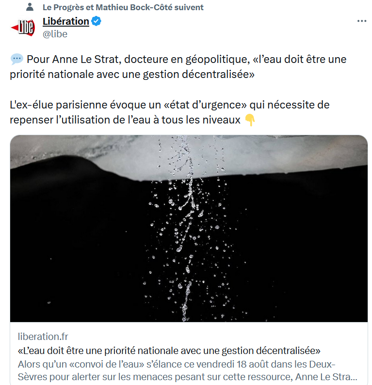 PS : si on pouvait dégager les acteurs privés de la gestion de l’eau (Véolia, Meridiam, la SAUR etc.), tout le monde ne s’en porterait que mieux.