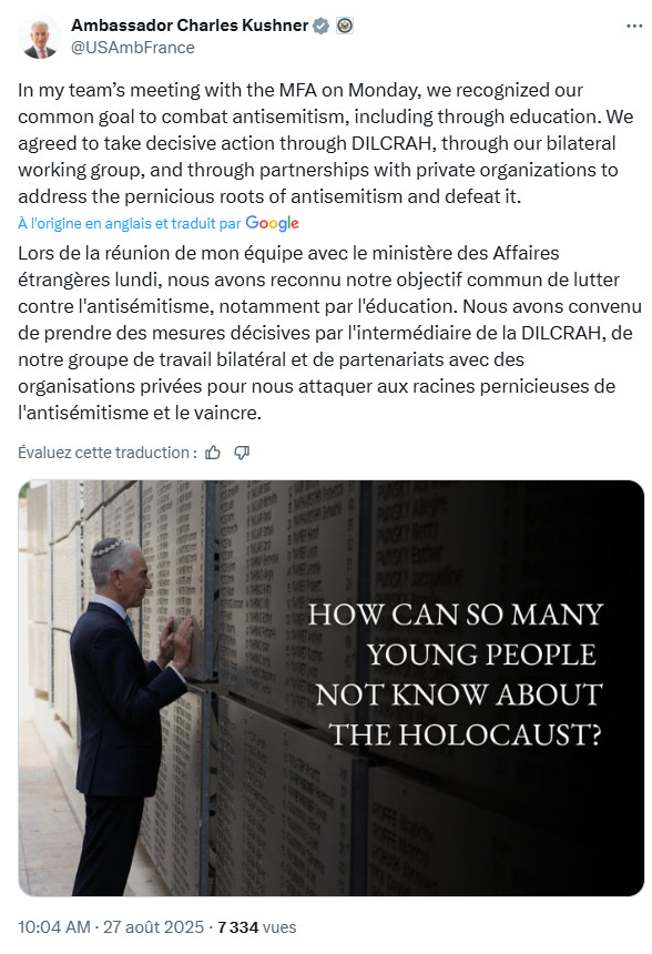 Charles Kushner continues to meddle in France’s domestic affairs, issuing directives to the French state while treating DILCRAH1—an agency ripe for elimination, a brilliant cost-saving idea—as a tool of American policy. As for “private organizations,” they, especially foreign ones, have no business interfering in France’s internal matters either.