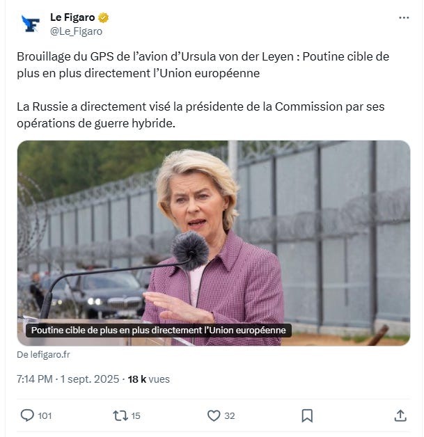 While the English-speaking media treads carefully, French outlets like Le Figaro go all-in : “Russia deliberately attacked the EU Commission President with its cunning hybrid warfare tactics.”