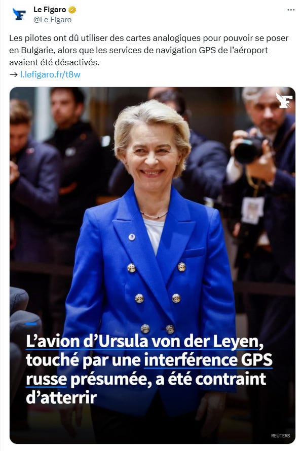 GPS jamming? That’s used for thwarting cruise missiles or low-flying drones, blanketing an entire area, affecting every aircraft in range. The idea that Russia would bother jamming GPS in Bulgaria is laughable—especially over someone like Ursula von der Leyen, who, let’s be honest, is barely a blip on the radar for the U.S., China, India, Russia and the rest of the world.