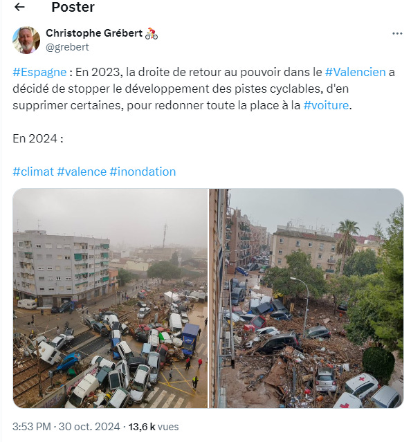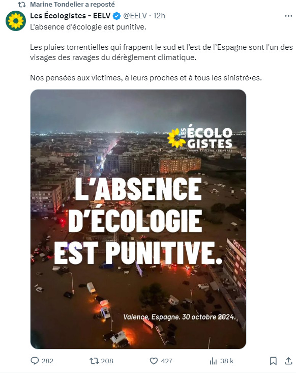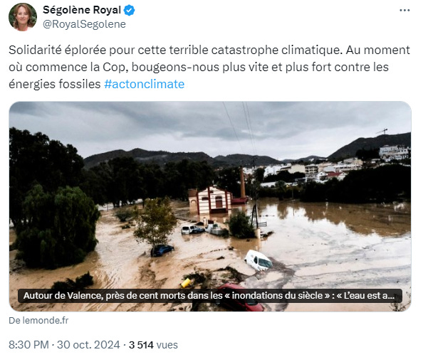 Les militants de tous poils ont immédiatement saisit la balle au bond pour propager l'énorme infox que la catastrophe naturelle à Valence est le résultat du dérèglement climatique.