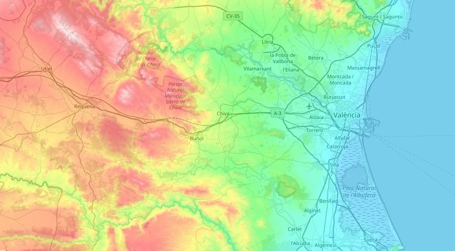 La ville de Valence est située à l’embouchure du fleuve Turia - là où il se jette dans la Méditerranée. Il suffit de regarder une carte topographique pour comprendre les risques important d’inondation en cas de pluies diluviennes, qui peuvent survenir l’automne.