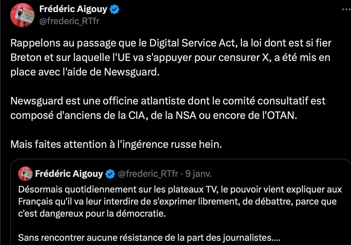 Ceci posé, et passablement bien organisé – cf. la garde rapprochée des représentants baltes atlantistes dont s’est entourée la présidente de la Commission européenne ou l’appui de la société américaine Newsguard 1 à la mise en place du DSA – la France s’agite beaucoup. Pas sûr qu’il en restera grand-chose à part une franche dose de ridicule à laquelle participe activement la classe médiatique mainstream.