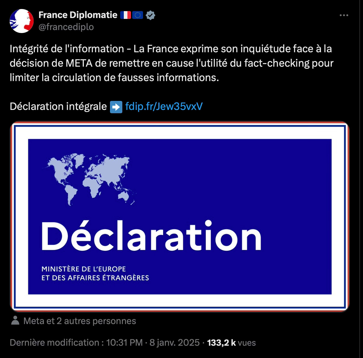 Mais la palme des “solutions” revient sans conteste à la diplomatie française – ou ce qu’il en reste. Non seulement, le ministère de l’Europe et des affaires étrangères est pris en flagrant délit de désinformation7 mais son ministre, Jean-Noël Barrot, croit visiblement impressionnant de jouer les va-t-en-guerre, appelant dans un nouvel accès de paranoïa autoritaire sous couvert d’une vraie fausse liberté d’expression (rappelez-vous les interdictions de Rumble ou RTNews), au bannissement de X.