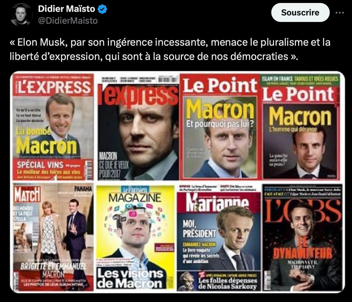 La notoriété de Musk est-elle artificiellement gonflée ? L’algorithme de X est public, il s’agit donc de l’analyser pour savoir ce qu’il fait et de simuler son utilisation sur un nombre de cas aléatoires suffisant pour le vérifier. Ce que n’ont pas fait les journalistes de France 2. On remarquera que la même question ne s’est pas posée quand les Unes à la gloire d’Emmanuel Macron se sont empilées – aujourd’hui c’est Gabriel Attal. On touche pourtant là tout autant à la volonté d’influence des médias qu’au pluralisme de la presse.