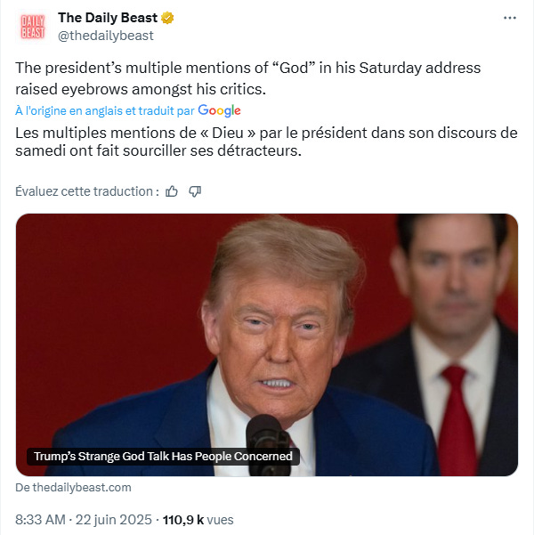 Quelle sera la réaction de l’Iran à ces frappes? Téhéran ne ripostera vraisemblablement pas sur les américains mais continuera à pilonner Israël, qui a déjà subi des dégâts considérables que les médias se gardent bien de rapporter. Trump ayant agi pour le compte de Tel Aviv, il suffit donc de poursuivre la guerre d’usure sur le proxy sans s’en prendre à son sponsor, comme le fait Poutine avec l’Ukraine. A ce petit jeu là, les Israéliens, qui n’ont aucun profondeur stratégique à part le soutien américain, perdront.
