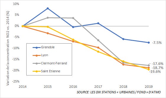 Regarder la moyenne, ville par ville, des données de l’ensemble des stations de mesures « urbaines fond » (terminologie Atmo) des quatre métropoles régionales, montre un déficit d’amélioration de l’air de 11% à Grenoble entre 2014 et 2019.
