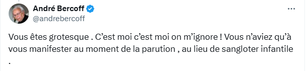 Pascal Clérotte, excédé, a fait part sur X de sa surprise et de sa désapprobation à André Bercoff. Il a reçu la réponse suivante – promptement supprimée par André Bercoff.