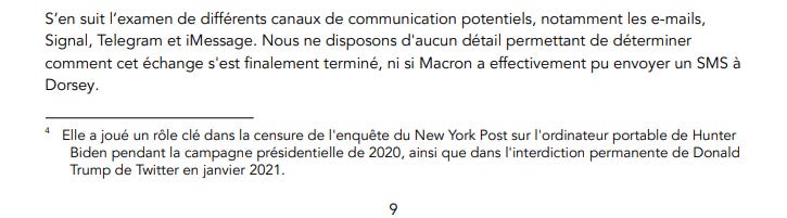 Un exemple: il a été affirmé à l’antenne de M. Bercoff que Jack Dorsey a refusé de donner suite à la demande d’Emmanuel Macron de lui envoyer un SMS. Nous n’avons pas établi cela. Nous n’en savons rien, c’est écrit en toute lettre dans le rapport, page 9.