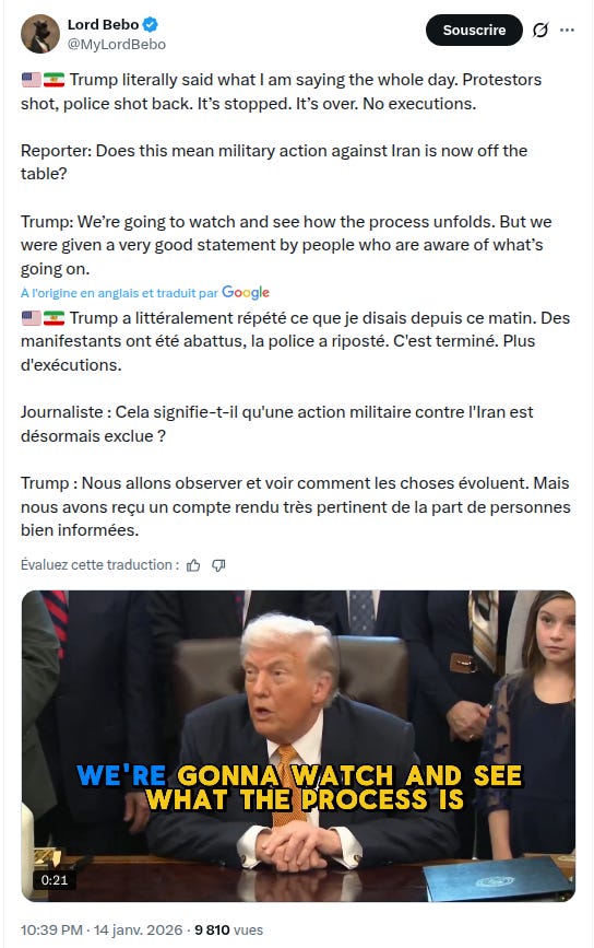 Elon Musk aura également des comptes à rendre, lui qui a laissé faire l’astroturfing israélien sur X et a été assez bête pour se vanter d’avoir “ouvert” Starlink et tolérer que des terminaux soient passés clandestinement en Iran pour coordonner les émeutes.