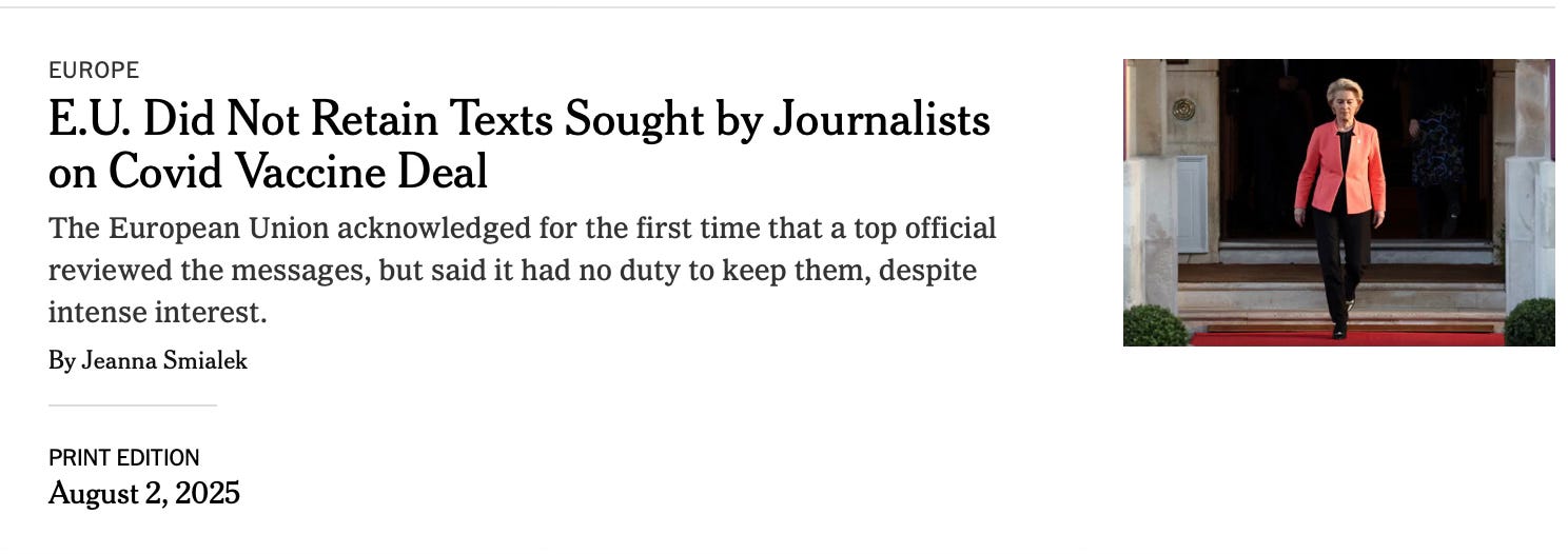 Dans un article, le New York Times publie la réponse de la Commission européenne à ses demandes répétées, appuyées par les tribunaux, de communication des SMS échangés entre Ursula von der Leyen et le PDG de Pfizer Albert Bourla lors des négociations qui, en 2021, avaient permis à la firme américaine, alliée à l’allemande BioNtech, de remporter le plus important contrat pour l’achat de vaccins conclu par l’Union européenne.