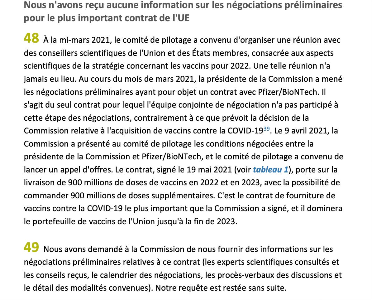 Ceci étant posé, ce n’est pas le moindre des questionnements. Car les procès-verbaux de réunion de négociation sont tout aussi légers, qui « détaillent rarement les points qui faisaient l’objet de négociation ». Et encore moins s’agissant de la réunion préliminaire avec Pfizer en mars 2021 puisqu’il s’agit du seul contrat pour lequel l’équipe de négociation n’a tout simplement pas participé. Et ce contrairement à ce que prévoit la décision de la Commission relative à l'acquisition de vaccins contre la COVID-19.