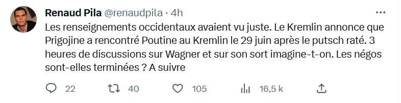 Il s’est agi, comme nous vous l’exposions dans notre podcast, d’une grosse engueulade à la russe qui ne porte pas à conséquence puisque l’issue en était connue d’avance et qu’elle ne visait que le ministère de la Défense et l’état major des armées. Personne d’autre. C’est contre Choïgou, le ministre de la Défense et Guerassimov, le chef d’État major des armées, que Prigojine hurlait. Pas contre Poutine. Choïgou et Guerassimov se sont débarrassés de Prigojine en le laissant faire.