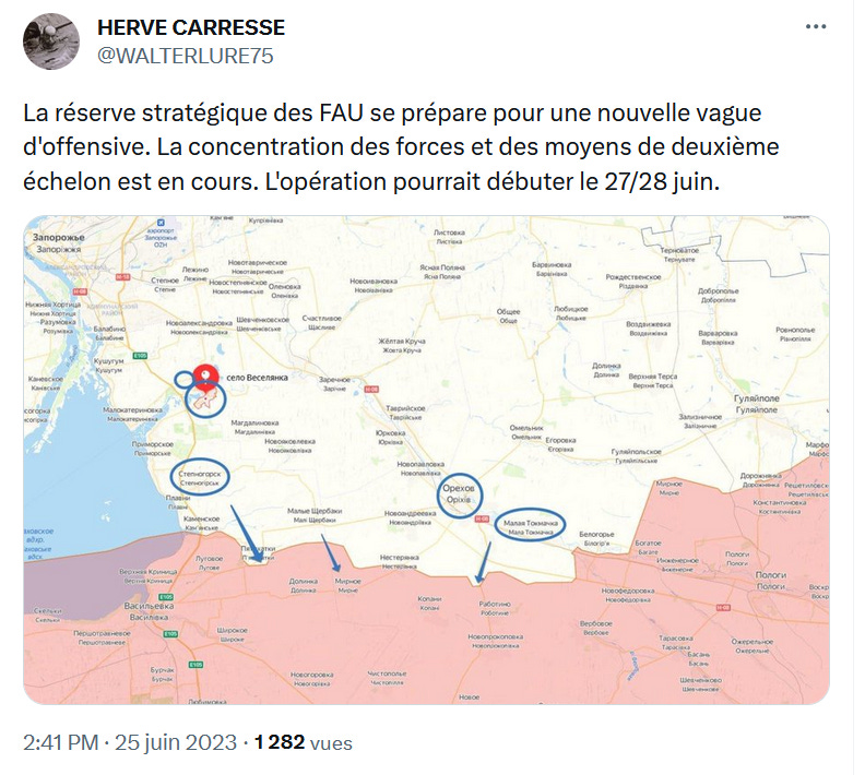 Gageons que cette nouvelle offensive ukrainienne se terminera en eau de boudin comme la première, l’Ukraine ne disposant pas de quoi obtenir un succès stratégique. Alors les Ukrainiens risquent de se retrouver très rapidement confrontés à une offensive russe qui ne sera pas menée comme au printemps 2022 par les bataillons tactiques, de petites unités très mobiles issues de brigades, mais par des divisions, des grandes unités de plus de 8000 hommes, qui seules disposent de la coordination, de la puissance de feu et de la logistique nécessaires à mener des opérations en profondeur dans la durée. Le tout bien à l’abri sous la suprématie aérienne russe.