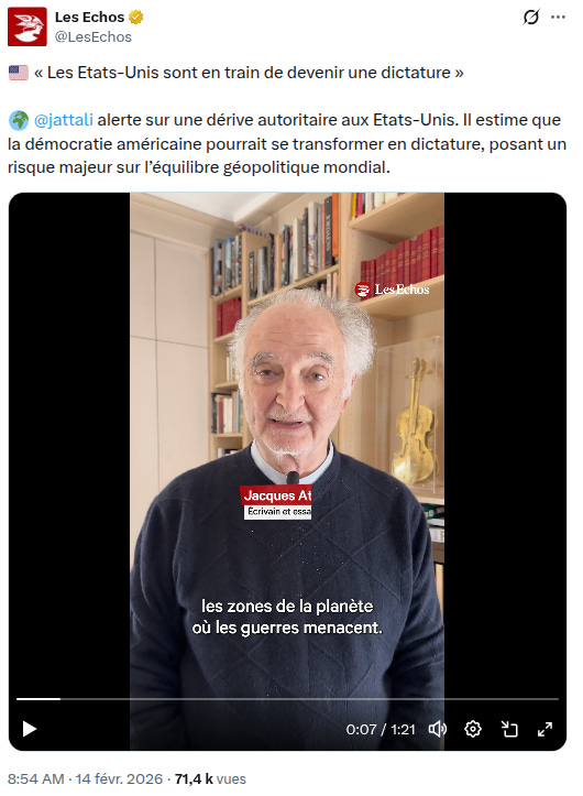 That was then, a year ago. Now Jacques Attali, former éminence grise of President François Mitterrand for 14 years, mentor of Emmanuel Macron, is asserting that America is on the verge of dictatorship. Maybe because he ain’t no kingmaker anymore.