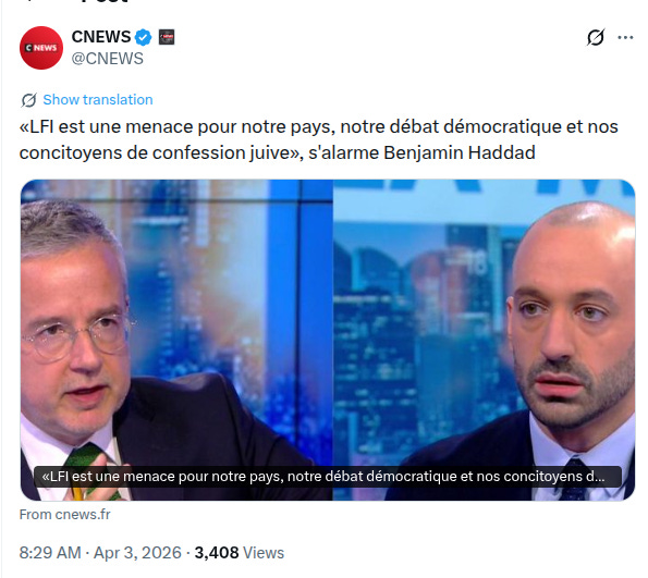 En revanche, nous ne manquons pas de noter le moment où la mise en garde à vue - et sa médiatisation - de Rima Hassan est intervenue. Juste après les municipales, où le bloc central s’est pris une dérouillée homérique et alors que l’infâme loi Yadan est examinée au Sénat. Et qu’Israël, Etat criminel et génocidaire, a perdu la guerre d’agression illégale qu’il a lancée contre l’Iran.
