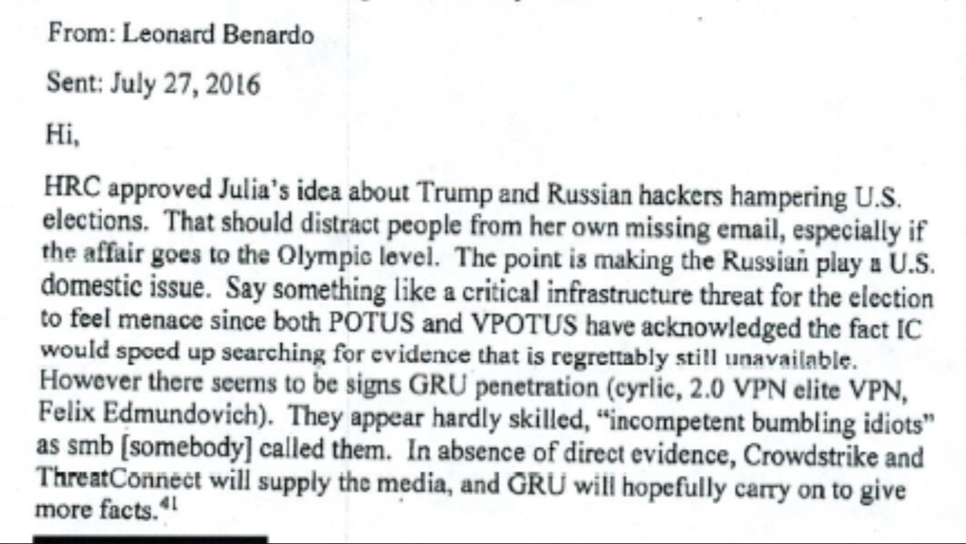 Les services de renseignement néerlandais avaient transmis en 2016 à la CIA des notes provenant des services russes qui, sur la base d'interceptions électroniques des communications de think tanks et de fondations liées au parti démocrate, révélaient l’intention de Clinton de monter une opération visant à présenter Donald Trump comme un agent du Kremlin.
