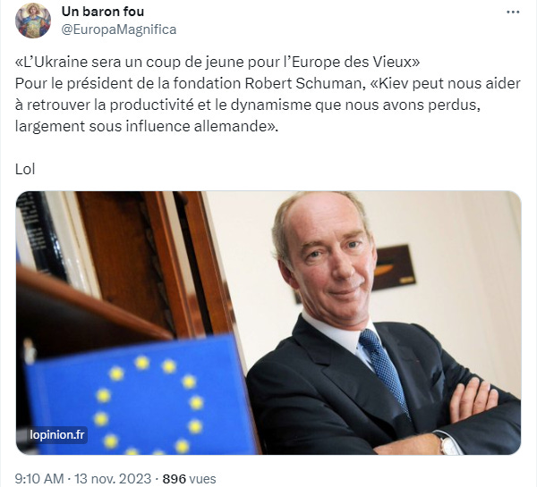 Résultat des courses : on essaie de nous forcer à accepter dans l’UE un pays mafieux, en ruine et dans les faits dirigé par des nazis. Pas demain la veille. Jean-Dominique Giuliani, le président de la fondation Schuman – à qui nous conseillons de faire ce que fit cette chiffe molle de Robert Schuman durant toute l’Occupation, prier – ose asséner que l’intégration de l’Ukraine à la “vieille Europe” lui donnera un coup de jeune alors que tous les jeunes Ukrainiens sont morts, estropiés ou ont déjà émigré. L’UE et l’Otan sont en état de mort cérébrale. Il va falloir les débrancher et trouver autre chose.