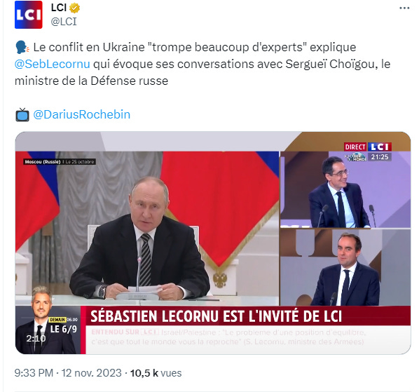 Sébastien Lecornu, l’homme qui nous tient lieu de ministre des armées, déclare sur LCI, visiblement très mal à l’aise et faisant écho à ses conversations (lesquelles ?) avec son homologue russe Sergeï Choïgu, que le conflit ukrainien trompe beaucoup d’experts. Comprendre “c’est pas ma faute, je n’ai pas eu la bonne information” ou bien “si vous avez raconté n’importe quoi, c’est pas ma responsabilité, moi j’ai toujours su”.