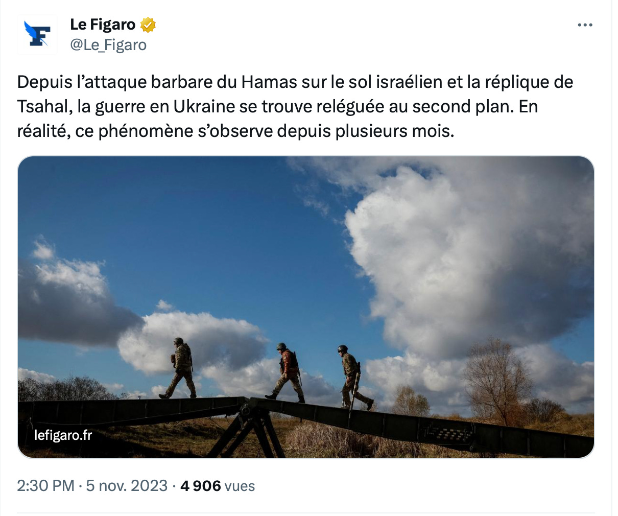"Depuis l’attaque barbare du Hamas sur le sol israélien et la réplique de Tsahal, la guerre en Ukraine se trouve reléguée au second plan. En réalité, ce phénomène s’observe depuis plusieurs mois", réalise (sic) Le Figaro.